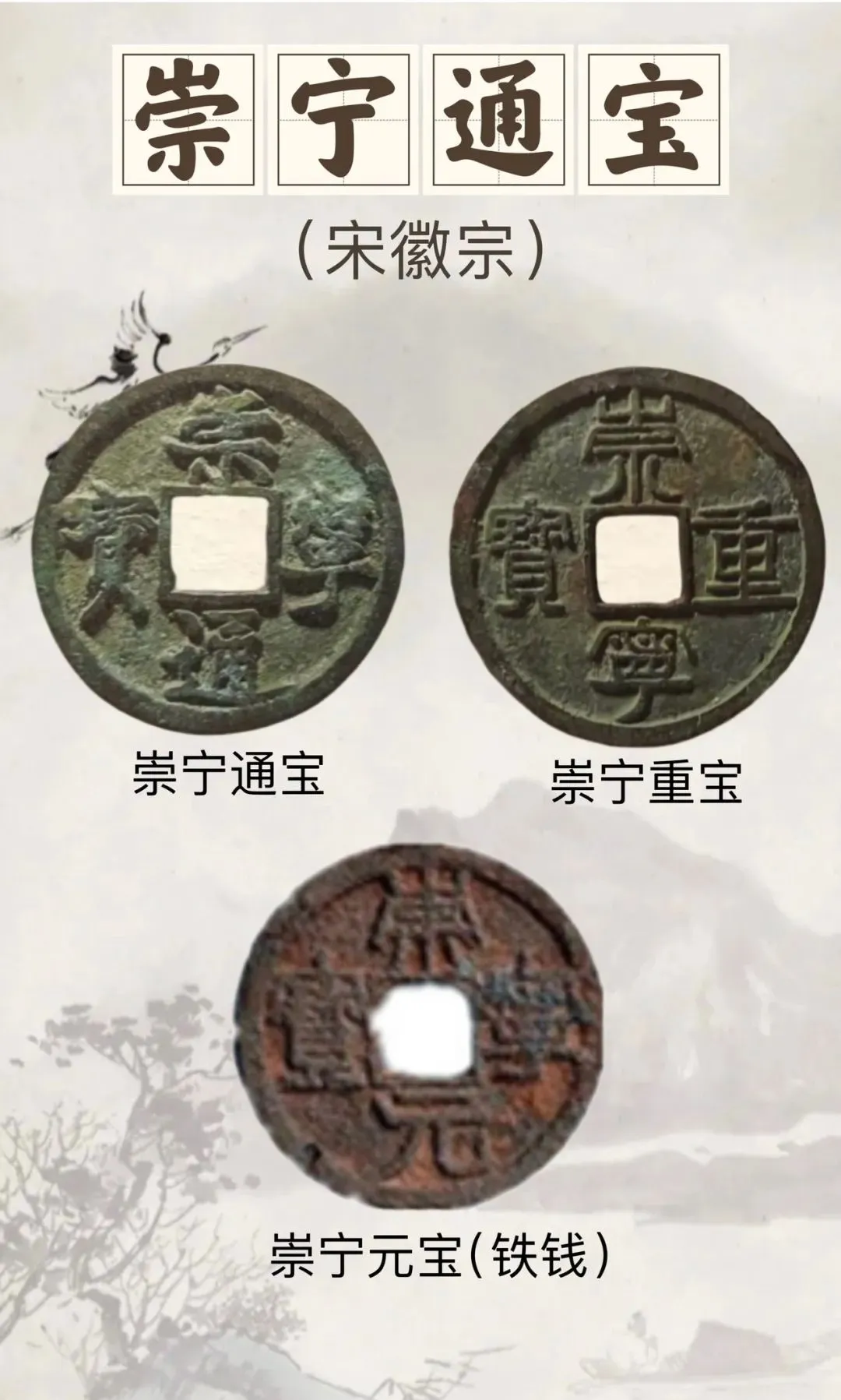 崇宁通(重)(元)宝宋徽宗赵佶崇宁年间(1102-1106年)铸年号钱。崇宁通宝有小平、折十两种,折二、折三多为私铸、后铸。钱文为赵佶手书“瘦金体”,铁画银钩,精美异常,版别颇多,并有铁钱。崇宁重宝材质有铜、铁、银,制作多亦精好,存世较多;钱文古朴方正,严谨庄重,法度固定,传为当朝宰相蔡京所书;另崇宁重宝版别几百种,面背记号多,有花穿、决文、面星、背星、月纹等。崇宁元宝小平极罕,隶书折二有铁钱、铁母存世。