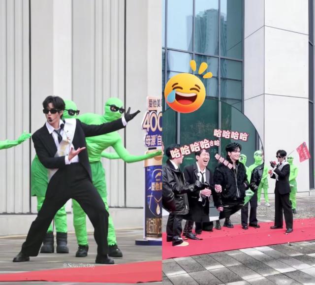 事实再一次证明AI真的战胜不了人类,一百个AI烧干CPU都想不出来这种欢迎仪式吧!我不说这是欢迎仪式,不少人得以为这是什么抽象MV拍摄现场呢。黑色西装、黑色墨镜,装备上耳麦和绶带的时代少年团-刘耀文就这样一本正经地在五位哥哥们面前跳上车摇欢迎哥哥们来到重庆,后面还有一排绿色“外星人”魔性伴舞,《宇宙闪烁请注意》这是把人干哪来了。