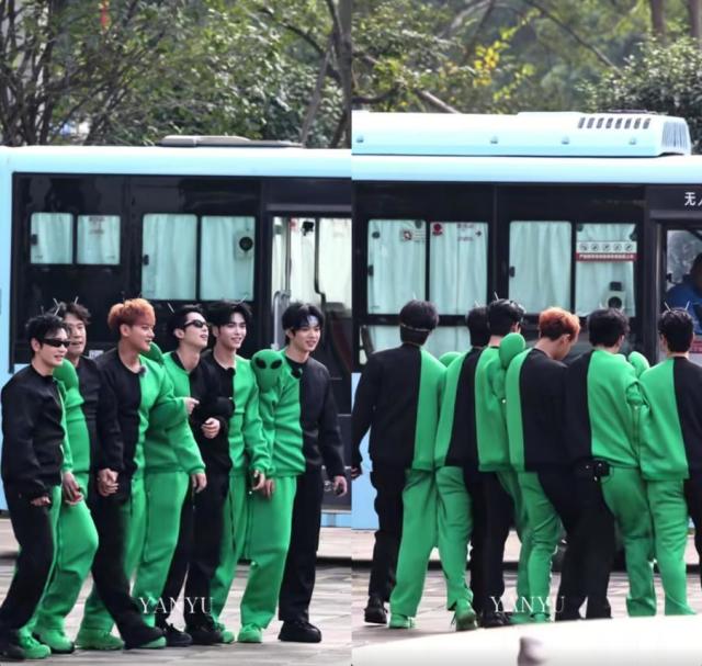 疯癫,真是疯癫得没边了。如果你要说一两个人疯癫算不得多疯癫,那咱来看看宇宙爆闪团全员集结后的样子。一个团的就是要整整齐齐,这六位一起出街是这样的,身穿黑绿拼色连体衣,头顶天线式发箍,整个宇宙的疯癫信号都被你们接收了吧。不知道大家在川渝吃饭时还有没有贡献疯癫名场面,重庆火锅、乐山钵钵鸡甜皮鸭之类的美食会被宇宙爆闪团吃出新花样吗,这么抽象的一个男团,吃饭只是简单的吃饭我还真不信,敢不敢放正片让我验证一下。