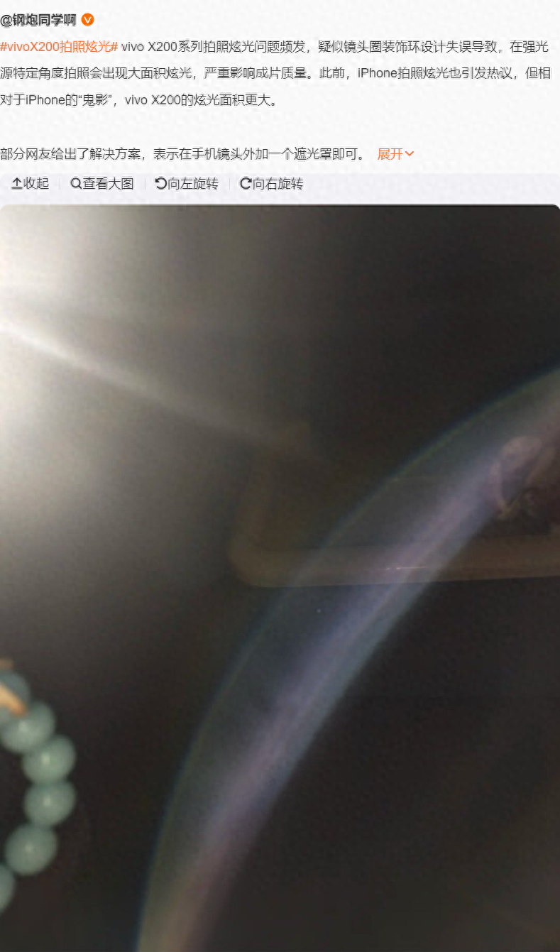 部分网友表示,在使用vivo X200 Pro拍照的时候,在特定的角度会出现炫光现象,一定程度上影响了使用体验。