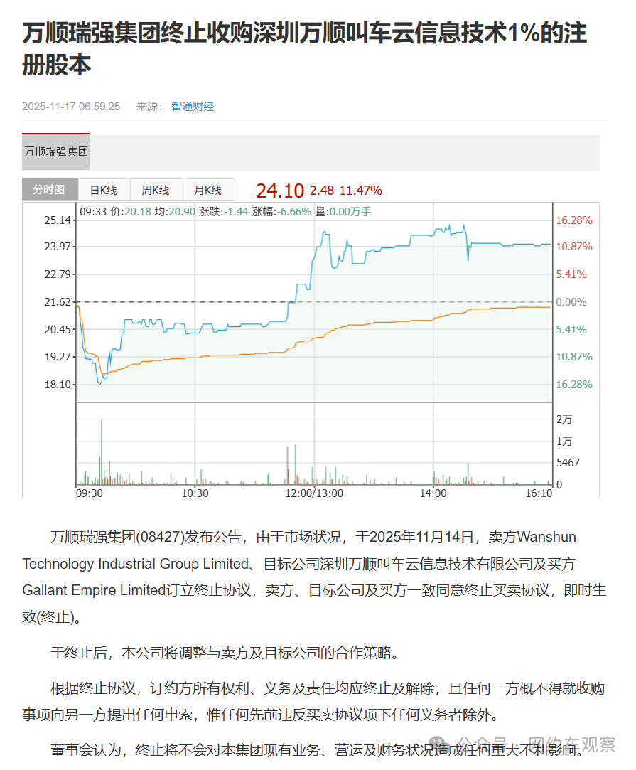 近日,万顺瑞强集团(08427)发布公告,宣布卖方Wanshun Technology Industrial Group Limited、目标公司深圳万顺叫车云信息技术有限公司及买方Gallant Empire Limited共同订立终止协议,一致同意终止买卖协议,且即时生效。这意味着万顺瑞强集团对深圳万顺叫车云信息技术有限公司1%注册股本的收购计划正式流产。