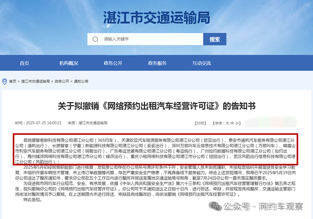 合规运营的缺失是万顺叫车的硬伤。据公开资料显示,2022年5月至2025年3月,万顺叫车在全国范围内被行政处罚高达80次,主要涉及使用无证车辆、驾驶员资质不符等问题。2025年5月以来,湛江、苏州、东莞、沈阳、河源等多地交通部门相继注销其经营许可,理由包括“行政许可被撤销”“未达到合规运营要求”及“许可证到期未延续”。