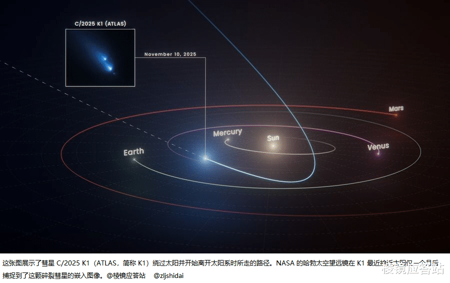2025年5月,ATLAS巡天系统首次发现这颗彗星。彼时,它还是一颗按部就班向太阳靠近的冰雪天体,直径约8公里,体量略大于普通彗星,携带着46亿年前太阳系诞生之初封存下来的原始物质。