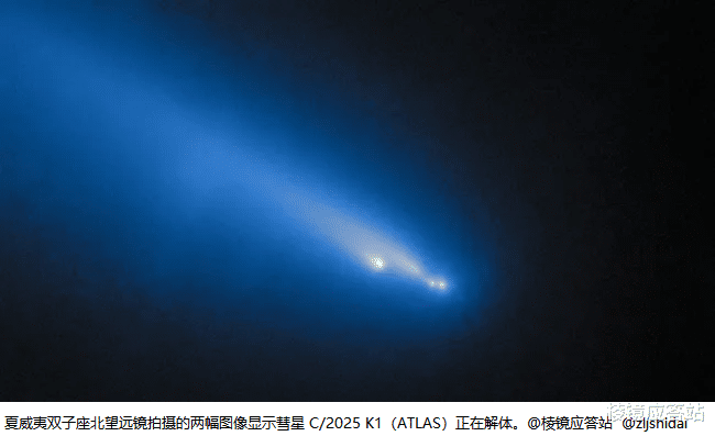 11月8号到10号,连着三个晚上,哈勃的空间望远镜成像摄谱仪(STIS)一帧一帧拍下了这颗彗星崩溃的样子。彗核已经裂成至少四块碎片,每块都裹着独立的彗发,就跟四个慌慌张张跑出来的孤儿似的,在星空里各自飘着,其中有一块,甚至在观测的时候又分裂了。