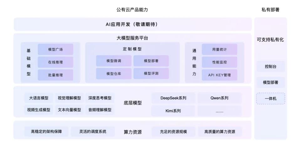 平台以高稳定的架构、高质量的算力资源为基础,通过自研模型和三方模型持续丰富底层模型生态,进而构建起一个高可用、安全易用的大模型服务与开发平台。通过兼容私有化部署,为企业级用户提供各种适应自身业务场景的调用方式。