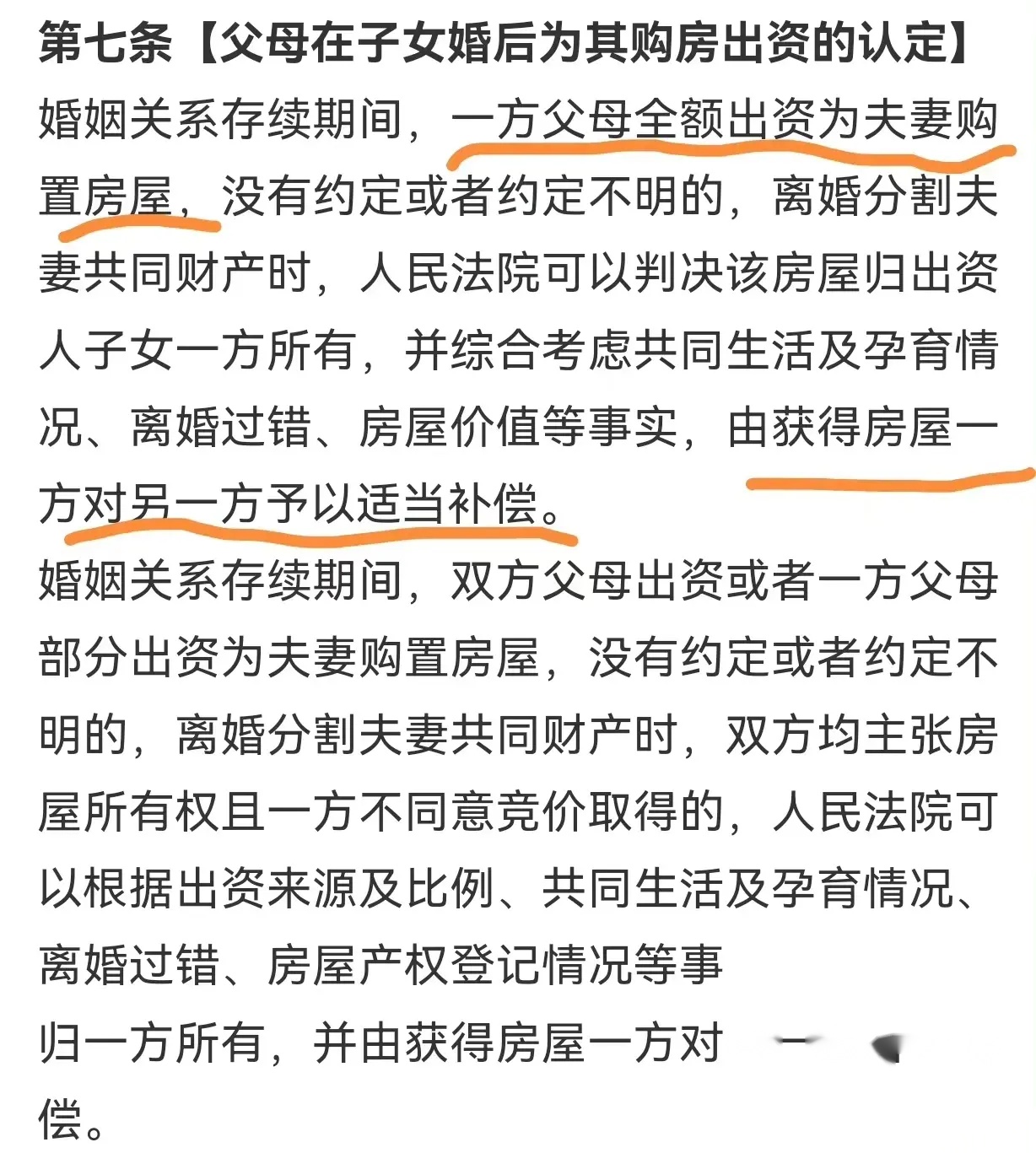 首先来说第七条,根据这一条的规定,如果父母在婚姻登记前或者婚姻关系存续期间出资购买的房屋,一方或者双方当事人主张属于个人财产的,应当提供相应的证据,如果没有证据证明该房屋属于夫妻共同财产,应当认定为个人财产。而对于没有提供证据的一方,可以推定该房屋为夫妻共同财产,也就是说,在离婚的时候,这套房子会被直接认定为夫妻共同财产,需要进行平等的分割。