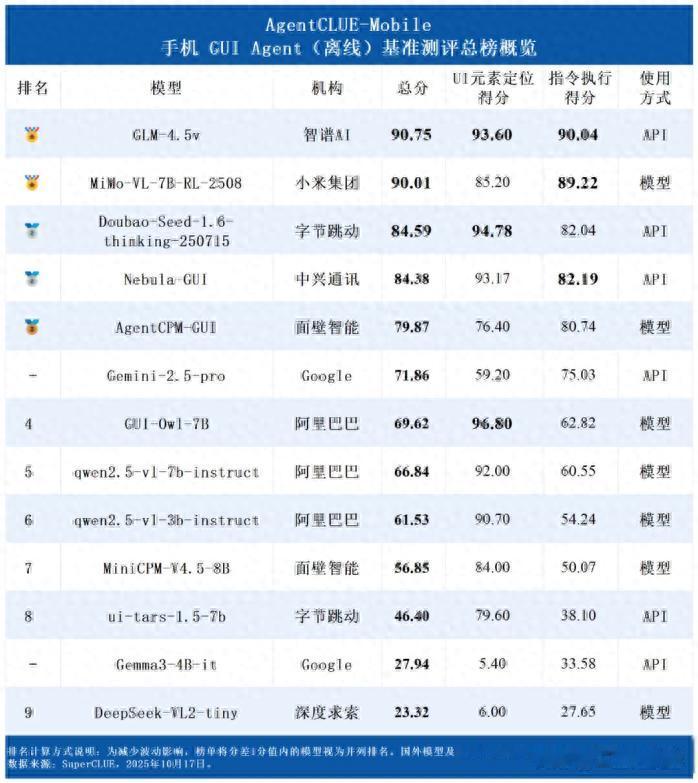 2025 年 10 月 17 日,SuperCLUE 正式发布首期 AgentCLUE-Mobile 手机 GUI Agent(离线)测评报告。该报告填补了行业统一测评标准空白,围绕中文用户日常使用场景展开,对 13 个国内外代表性智能体产品进行全面评估。其中,中兴通讯旗下 Nebula-GUI 表现亮眼,以总分 84.38 分斩获银牌,在 UI 元素定位与指令执行两大核心能力上展现出强劲竞争力,成为本次测评中极具代表性的国产终端智能模型之一。