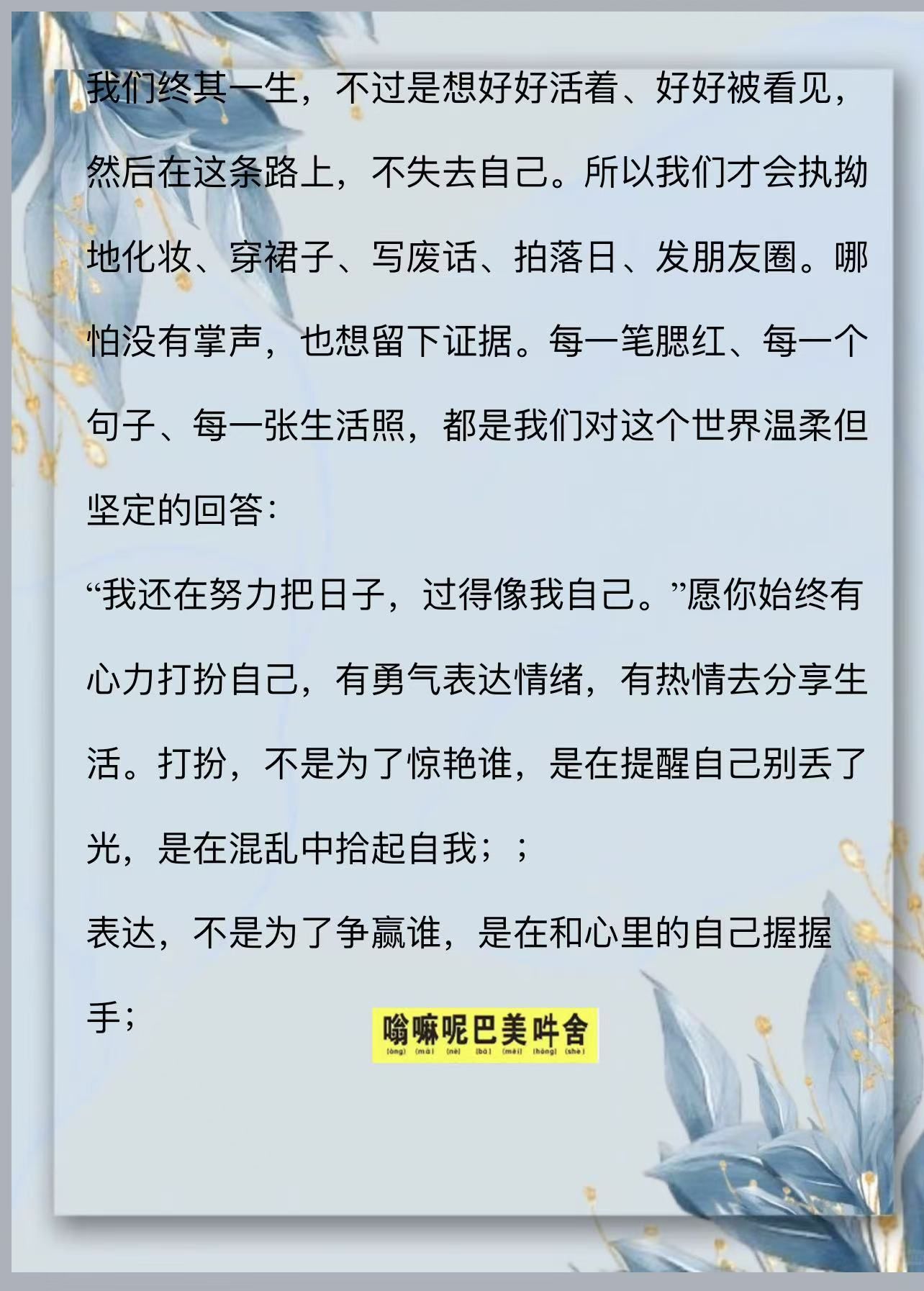 “我还在努力把日子,过得像我自己。”愿你始终有心力打扮自己,有勇气表达情绪,有热情去分享生活。打扮,不是为了惊艳谁,是在提醒自己别丢了光,是在混乱中拾起自我。