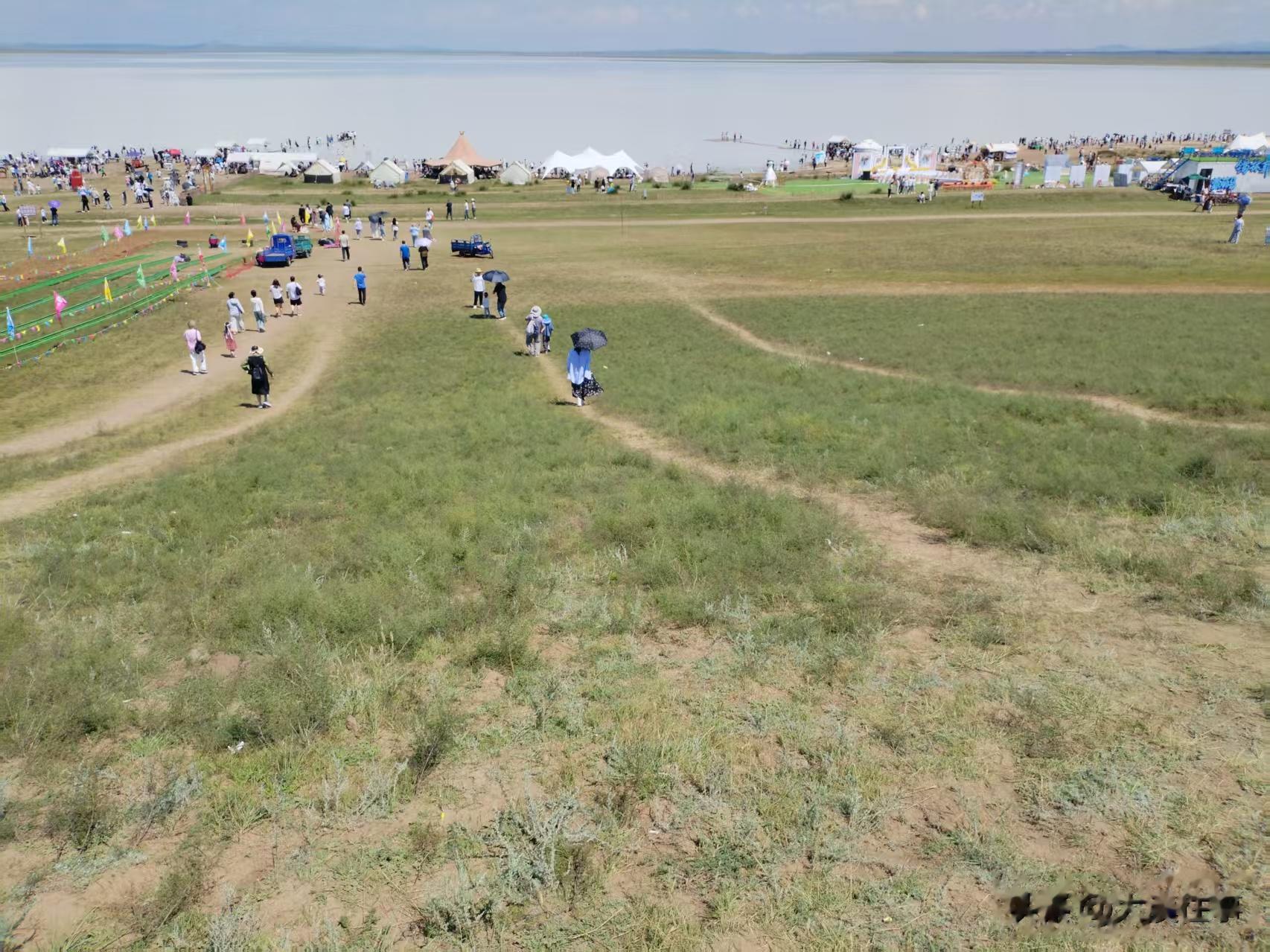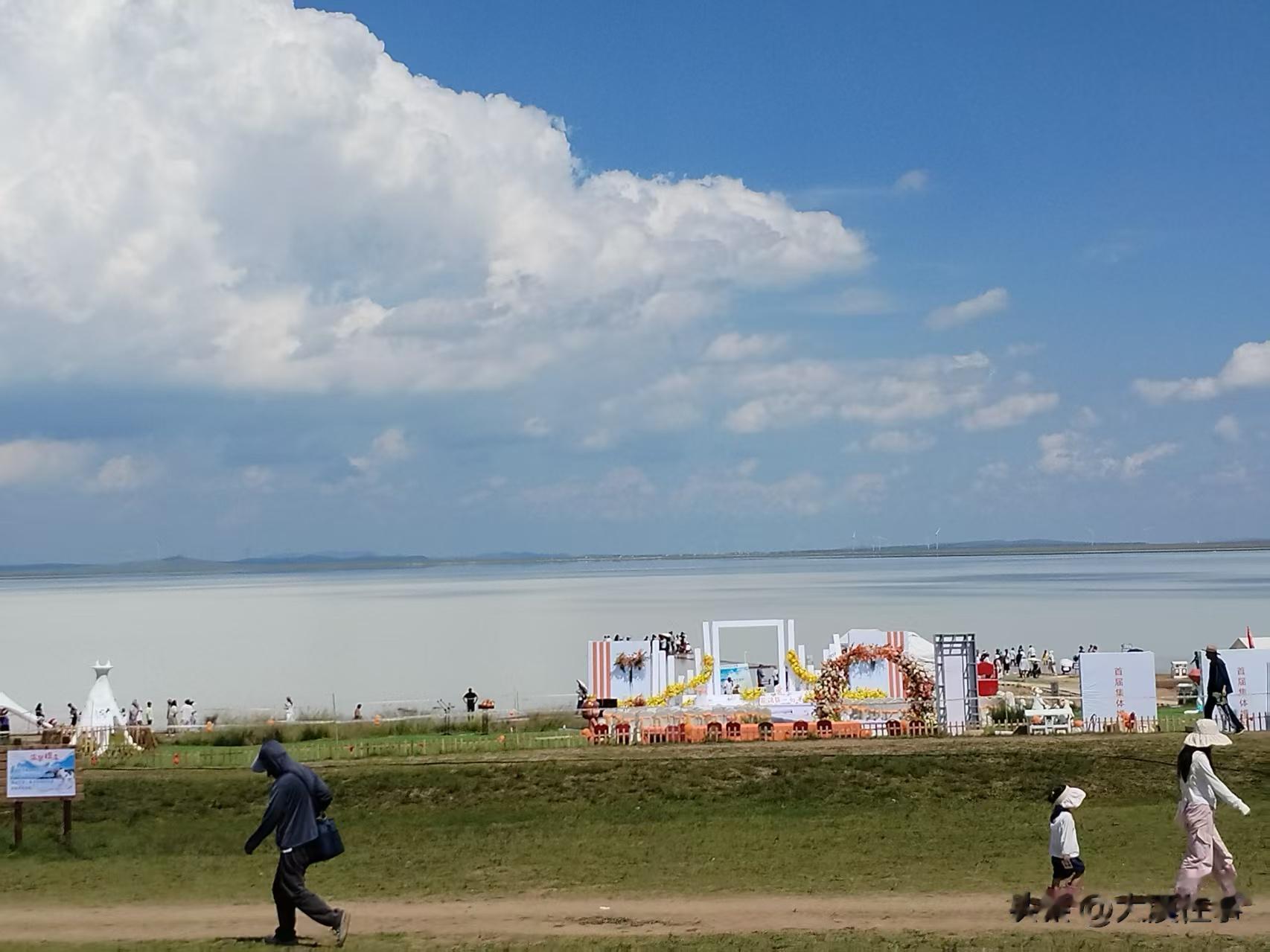 来到湖边,有一些营业性的摄影小区,可以与蒙古马、湖边草地、湖区等背景合影,也有拍摄婚纱照的满脸喜气的年轻人。