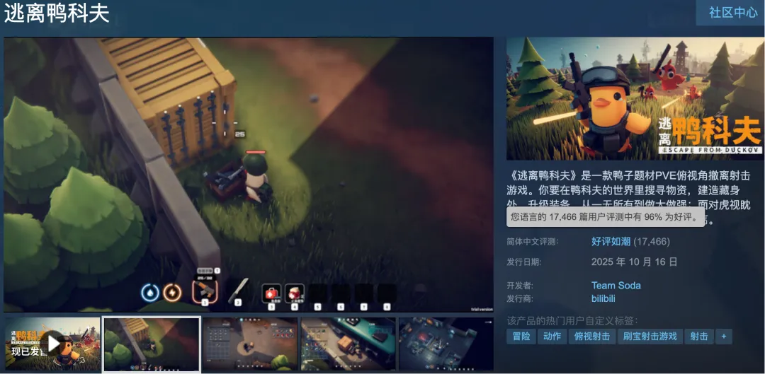 第10:《逃离鸭科夫》《逃离鸭科夫》是一款俯视角PVE撤离射击游戏,发售3天内销量即突破50万份,并登顶Steam国区热销榜,好评率高达95%。玩家将扮演“打工鸭”,在随机生成的动态地图中搜刮物资,通过武器改装、技能树升级和建造藏身处来强化自己。游戏以其黑色幽默的风格和“去其糟粕,取其精华”的核心循环设计,获得了包括《逃离塔科夫》制作人在内的广泛好评。