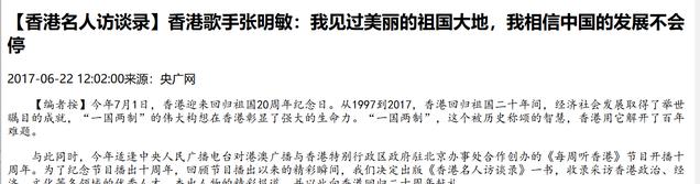 央广网在2017-06-22关于《【香港名人访谈录】香港歌手张明敏:我见过美丽的祖国大地,我相信中国的发展不会停》的报道