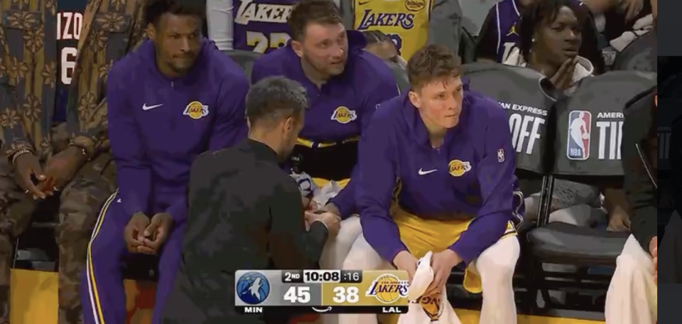 次节比赛中,场上出现揪心一幕。由于在首节比赛中因为切球造成手指挫伤,东契奇在节间休息期间紧急接受队医在场边的治疗,东契奇露出非常痛苦的表情。不过东契奇次节仍然拿到9分,其中罚球7中7,仅上半场比赛便砍下32分,帮助湖人队迎头赶上!