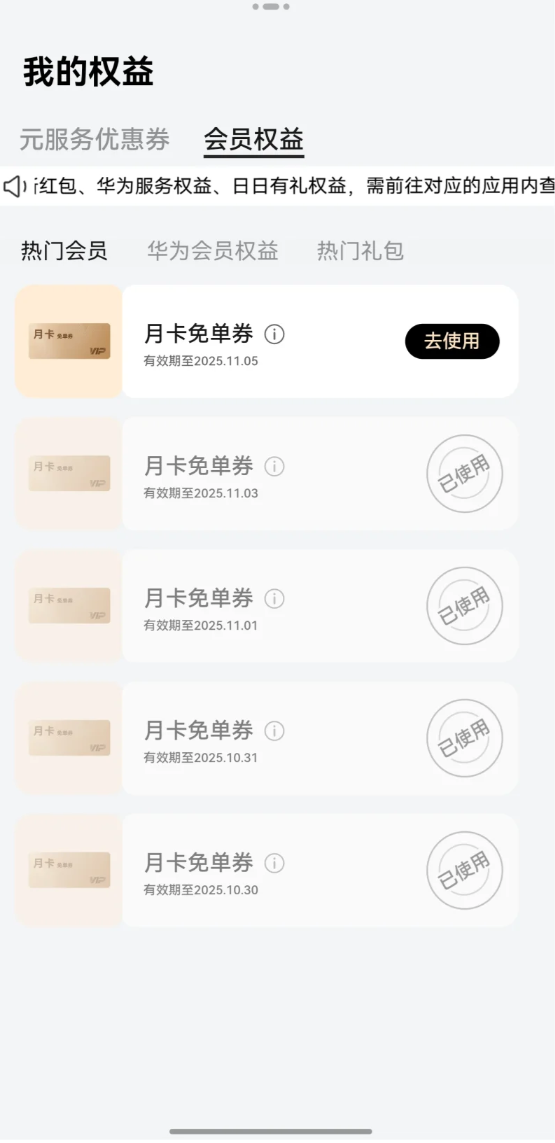 亲测能薅的会员福利,华为用户速冲。操作十分简单,把华为手机升级到鸿蒙5.1及以上版本,从桌面右滑进负一屏,点击进入“鸿蒙有礼”活动页,每天签到领随机红包还有热门应用会员月卡免单券等超值权益。我就是用月卡免单券兑换了芒果TV会员。更关键的是,月卡免单券还可兑换B站、优酷、WPS、喜马拉雅、知乎、网易有道词典、宝宝巴士、书旗小说等超过20个热门应用会员,总有你用得上的。