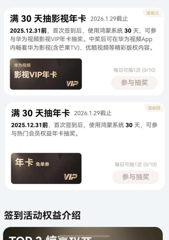另外,首次签到30天后,不但能参与抽影视年卡礼包(包括华为影视+优酷的双年卡),还可以抽“热门应用年卡免单券”,中了之后可以在哔哩哔哩、WPS、优酷、喜马拉雅、芒果TV这5个App里“五选一”!每天有1次抽奖机会,最多能抽10次。