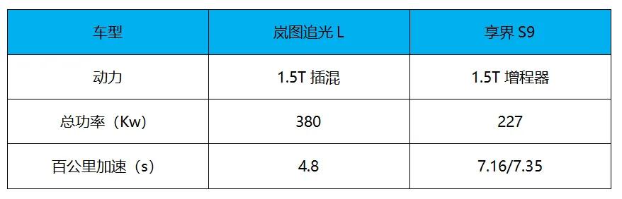动力我们对比插混版和增程版,岚图追光L是插混,动力更强。1.5T发动机,双电机四驱,前后电机总功率380千瓦,系统总功率最大可达485千瓦,前后总扭矩695Nm,零百加速4.8秒。享界S9搭载1.5T增程器,单电机后驱,最大功率227千瓦,最大扭矩320Nm。零百加速7.16秒/7.35秒。优势自然给到了岚图追光L。