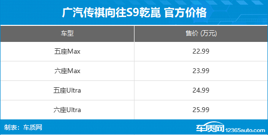 2025年9月19日,广汽传祺向往S9乾崑正式上市,新车共推出4款配置,售价区间为22.99-25.99万元,限时置换价21.99-24.99万元。新车定位为中大型SUV,提供5座和6座两种布局可选,全系标配华为乾崑ADS 4 Max超阶版,搭载1.5T插电式混合动力系统。