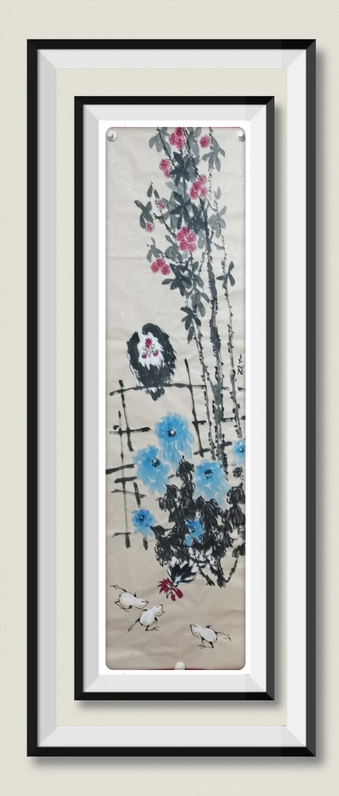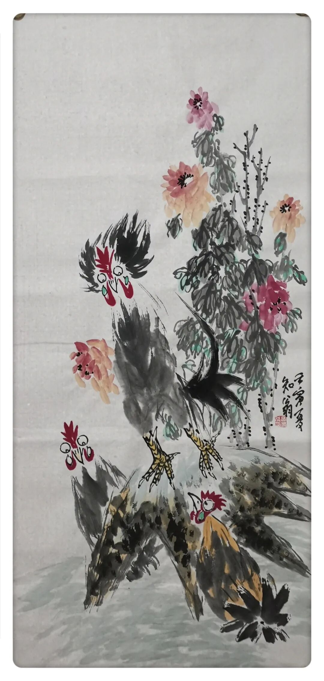 纵观高崇斌的作品,皆可以用“多姿”来形容。在他的笔下,花鸟形态各一,以公鸡为例:飞翔的公鸡,那是展翅的精灵,血红的鸡冠昭示着斗志和奋发的精神;而严阵对视的公鸡,则是毅力的坚持,寸土不让的执着,和勇猛向前的无畏精神。你看,它身上毛发竖起来了,全神贯注地注视着对方,两脚紧紧地抓住地上,随时准备发起新的攻击。那悠闲觅食的公鸡,更是物我两忘,搜寻着地上昆虫小动物。怡然自得的憨态,让人过目不忘。公鸡的旁边,则是陪衬的花草,和幽静的背景。不管从哪个角度来欣赏高崇斌的作品,一种美的享受,陶冶的情操,自心中油然产生。