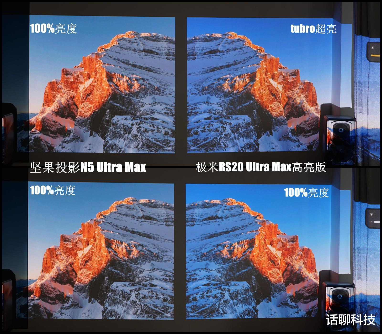 先来说亮度。下图是实拍的坚果N5 Ultra Max 亮度100%分别与极米RS20 Ultra Max高亮版在tubro高亮、100%亮度下的对比。可以看到亮度上两者区别并不大,直观的是色调的不同,极米冷色调输出更多,日照金山背部的积雪都变成蓝色了,画面有点不自然;而坚果的画面相对自然一点,天蓝色依旧是天蓝色、雪白依旧是雪白。(备注:同屏拍摄情况有一定差距,不完全还原肉眼所见画面)
