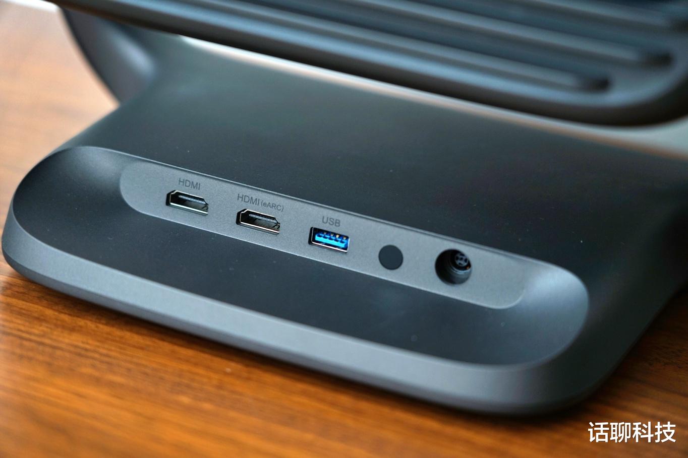 而从电源和接口来看,电源线都在云台底座上,但极米的电源开关和双HDMI、双USB接口都在机身后侧,这样的设计有一个小小弊端就是每次开机,或插拔电源肯动会导致投影角度变化。