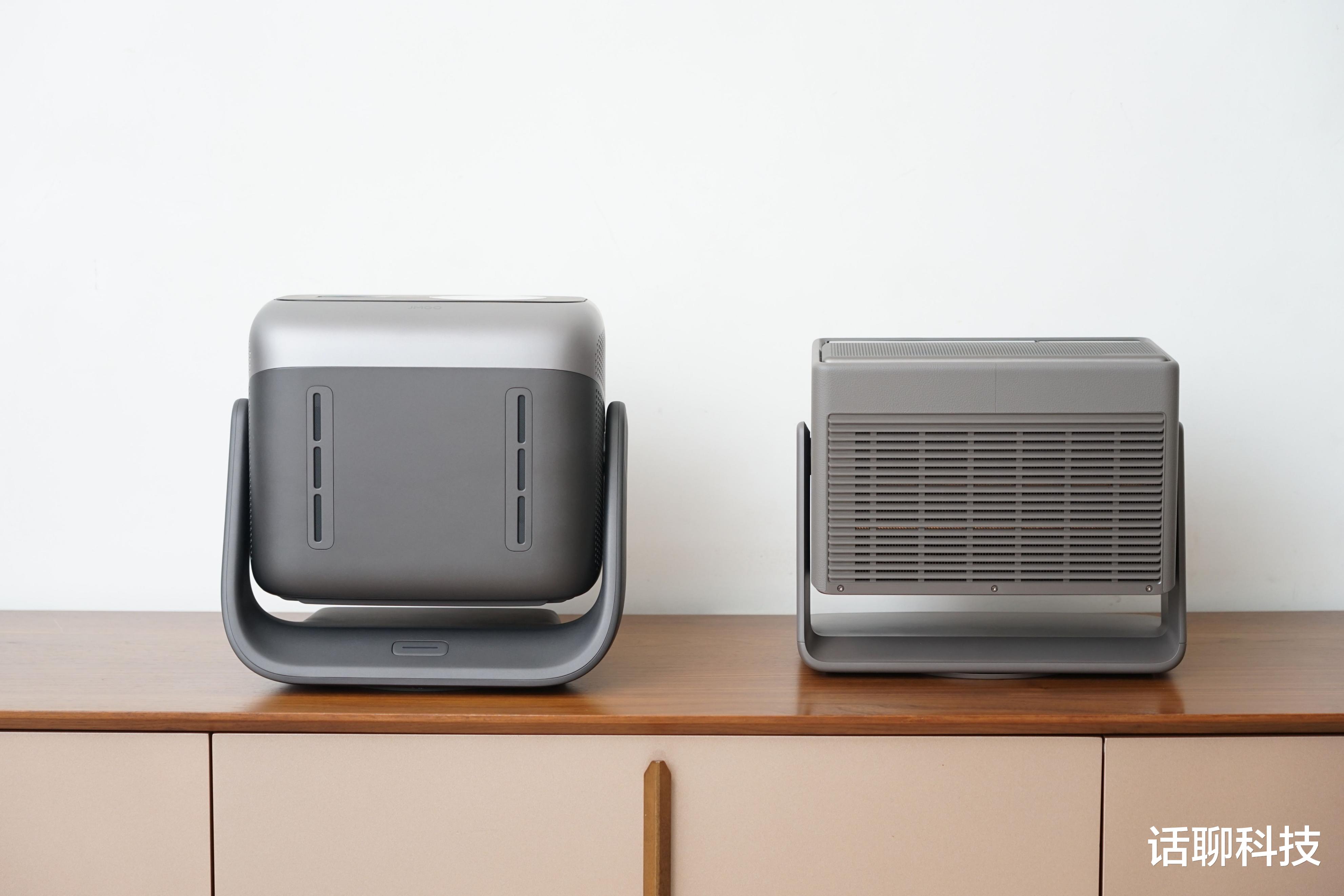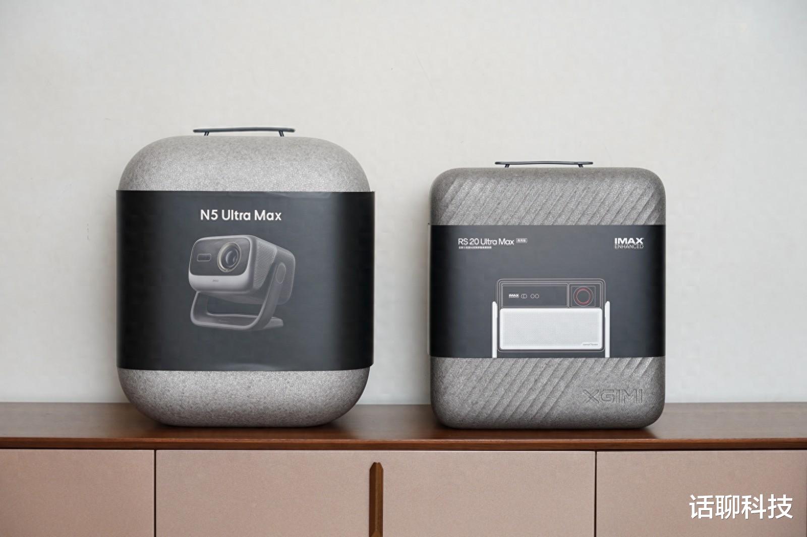 从外观来说,坚果N5 Ultra Max是机身圆融无棱角的现代风格,给人一种金属质感的大眼萌宠的感觉。而极米RS20 Ultra Max高亮版是有点像复古收音机的造型,给人的感觉,给人的感觉是怀旧轻奢。