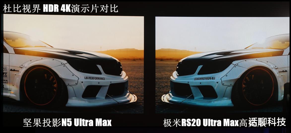 再比如播放杜比视界HDR视频,也能感觉到整体色调,极米偏冷,车头的暗部区域明显蓝色冷调,不自然,坚果相对更色正。下图是播放白色超跑逆光的画面,自己可以去感受一下,你更喜欢哪个的色彩。