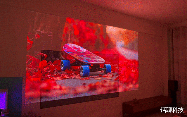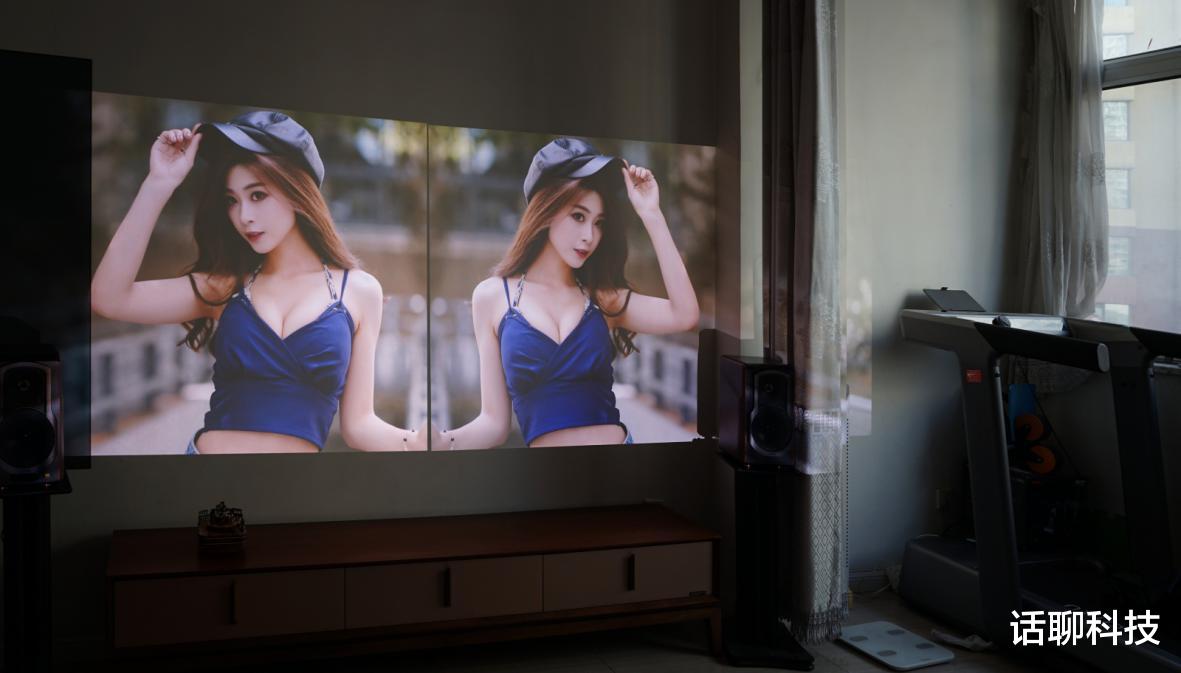 为了更直观对比,我将两台投影仪同样以2.5米距离在白墙上无损变焦投放80英寸画面进行了实测对比。两台投影仪都用默认图像模式,并用索尼A7M3相机在自动白平衡和自动ISO下记录画面,所有实拍图左侧为坚果、右侧为极米。