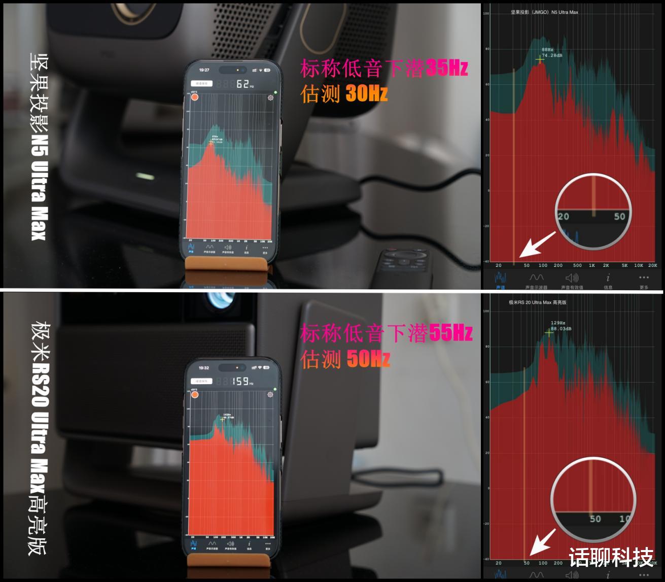 至于官方标称的低音下潜频率,我也用iPhone16 Pro手机声谱分析工具进行了粗测。测量方式是,同样音量、播放同一首歌,记录声音频谱的最大峰值(蓝色阴影),最后看曲线,发现坚果N5 Ultra Max在30Hz依旧有较高动态响应,而极米RS20 Ultra Max高亮版50Hz以下就没有动态响应了!