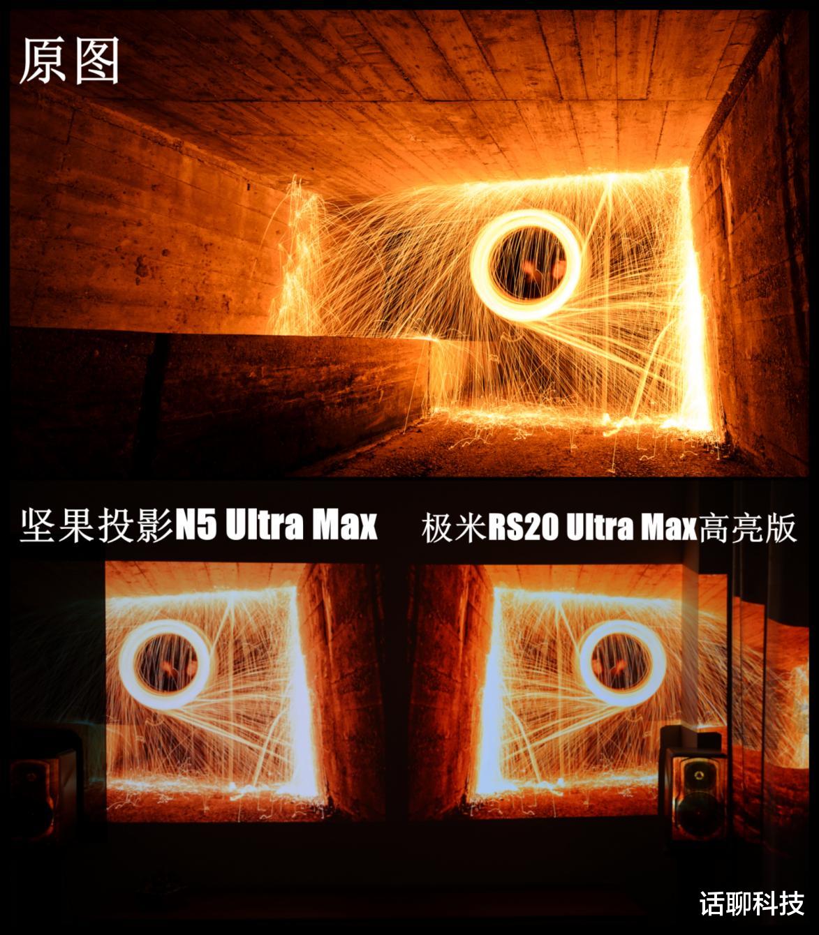再比如播放下图这种打铁花的图片,两款投影仪的ISO亮度都在6000流明以上,都能把火花那种极亮的感觉体现出来,但要说细微的细节差异直观感受不明显。
