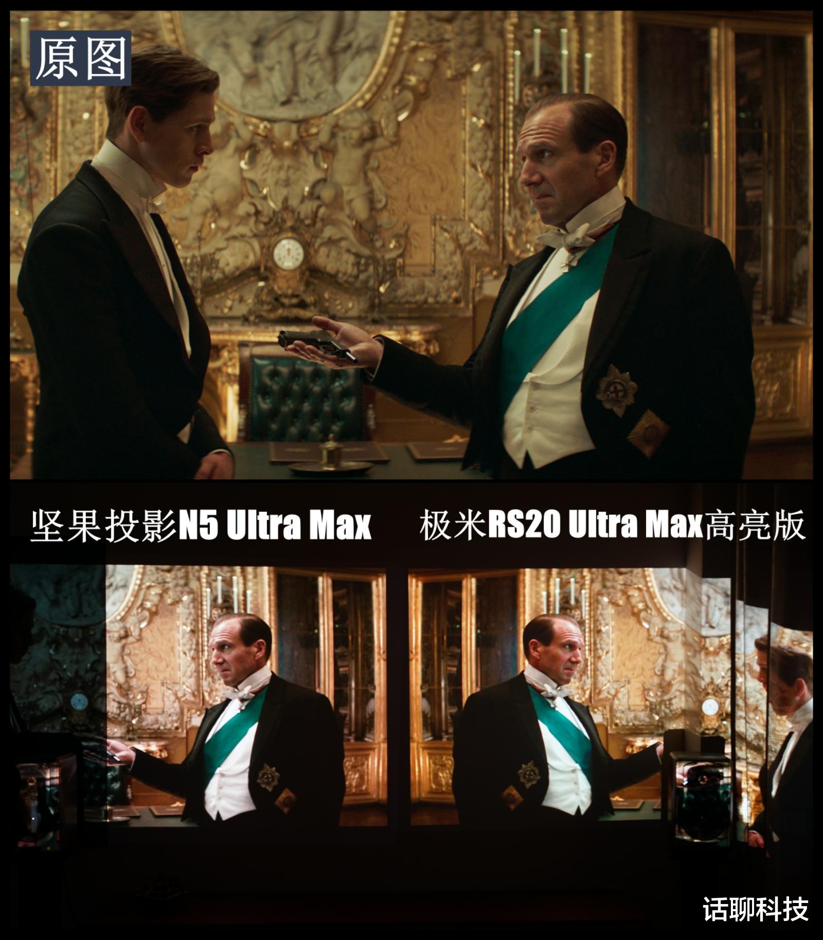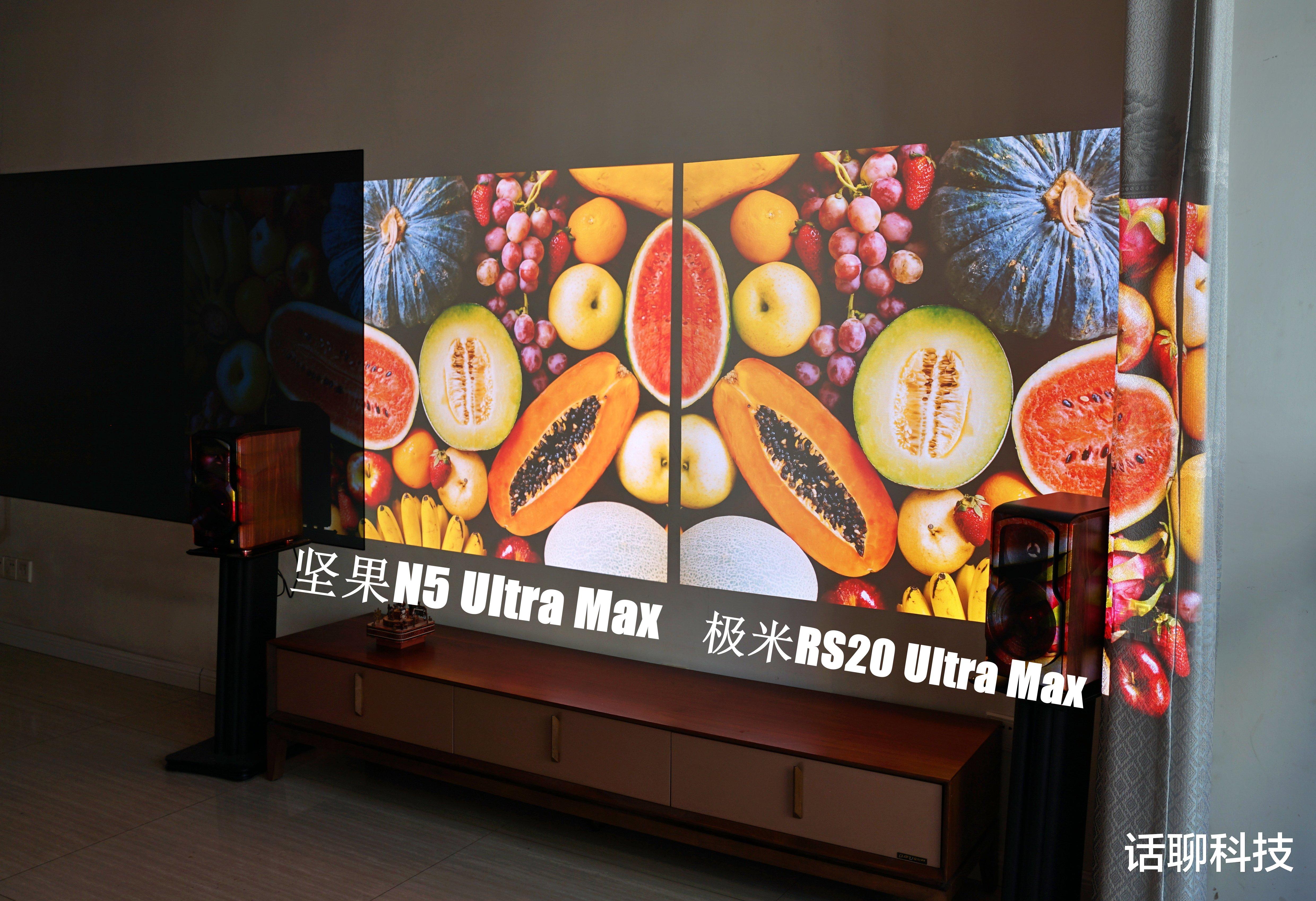 总之,从画质对比来看,两者亮度都够用,尽管标称有差异,但直观感受不明显,色彩上都是三色激光显示,总体都是目前投影仪中top级的表现,略微的差异是坚果N5 Ultra Max 的色准更好一丢丢,默认模式色彩更自然;极米RS20 Ultra Max高亮版的有一点点偏冷,在画面渲染的时候饱和度略偏高。