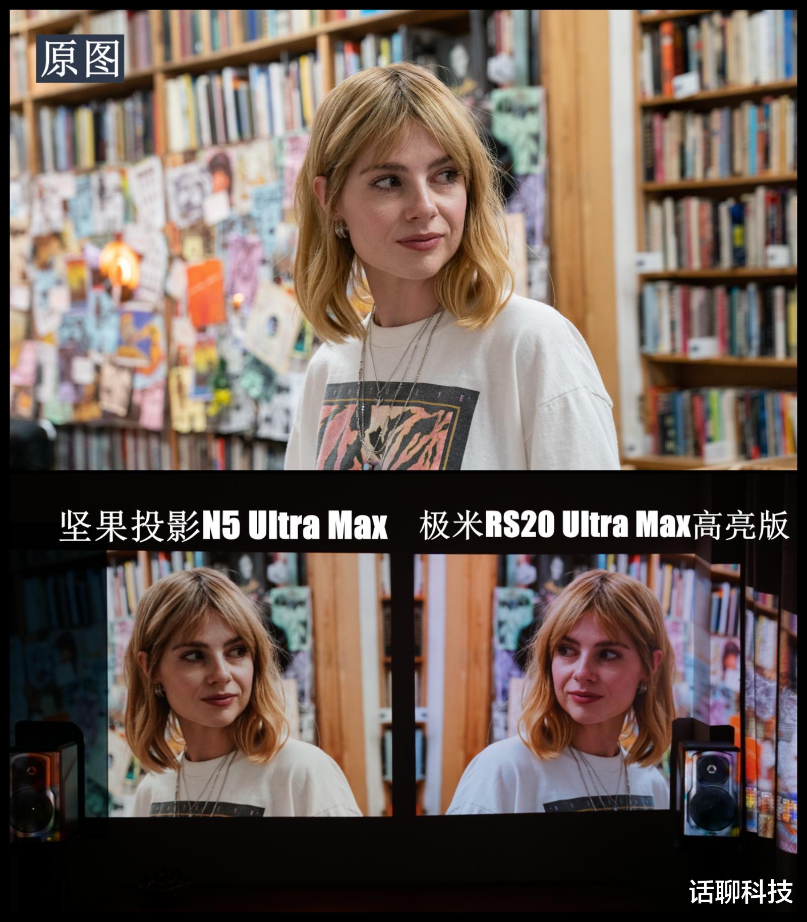 首先从白平衡来看,我实测了很多画面,肉眼的感觉比相机要更直观,但基本一致,都是坚果相对更自然,极米略微有点色彩还原畸轻畸重。比如显示下图人物画面,明显可以看出黄色头发、棕色面部、白色T恤的色彩都是坚果要略微好一点。