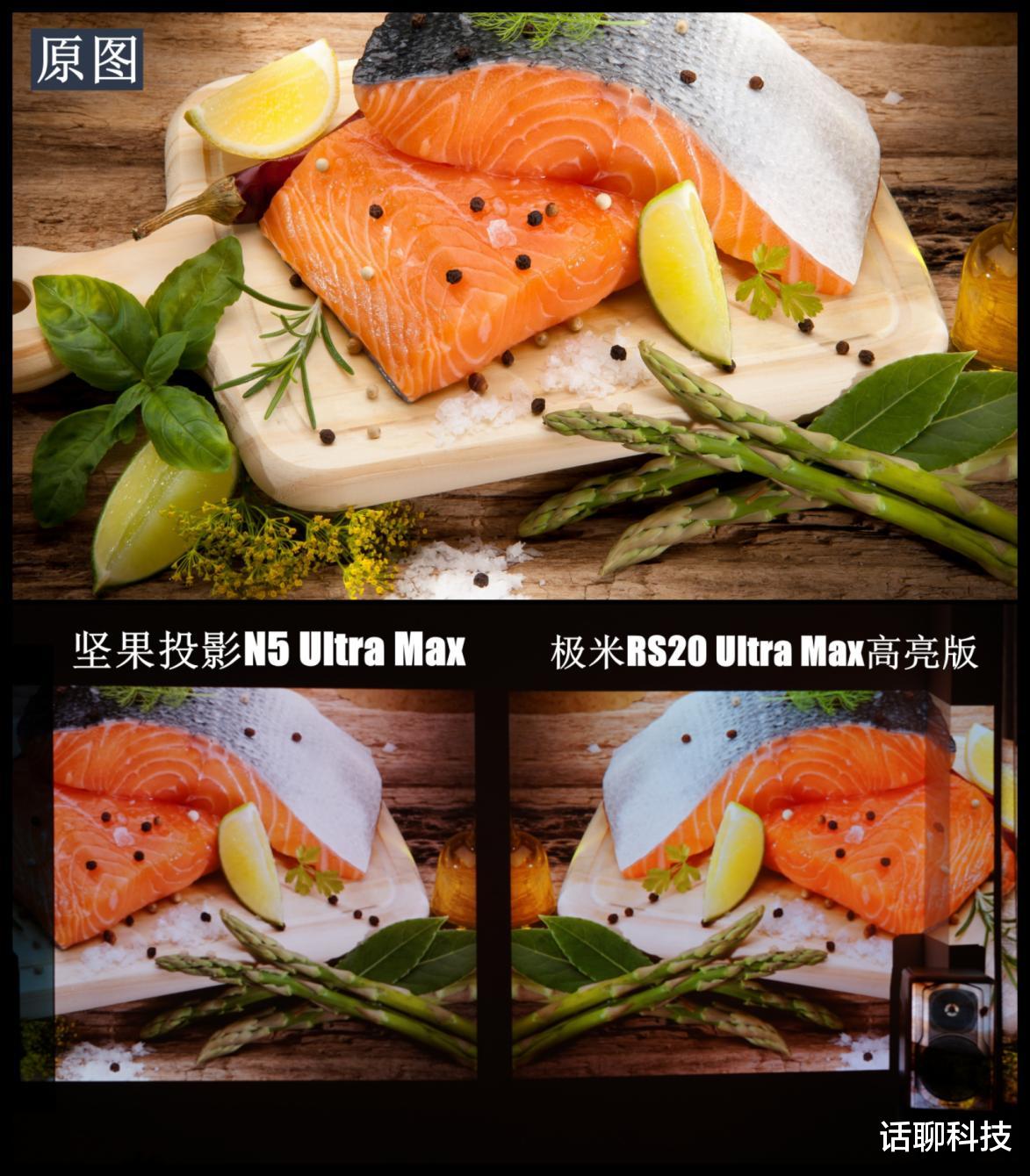 当然这种色彩的差异在显示美食的时候也更明显一点点,比如显示下图三文鱼的画面,鱼肉红白相间,鱼皮黑灰白过渡,坚果显示的与原画面色调更一致,鱼腹皮白色更自然,而极米也是偏蓝也一点。