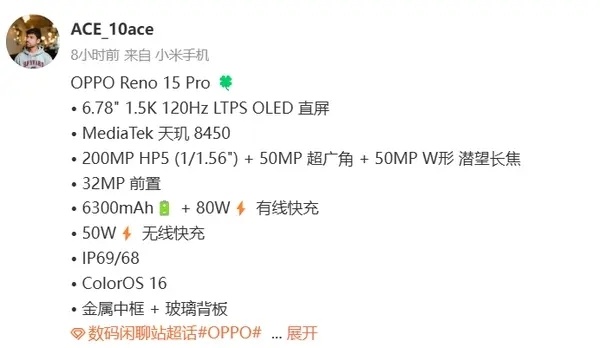 近日,有多位博主曝光了OPPO Reno15系列新机的消息,根据爆料来看,该机将配备后置2亿像素三摄组合+80W闪充+