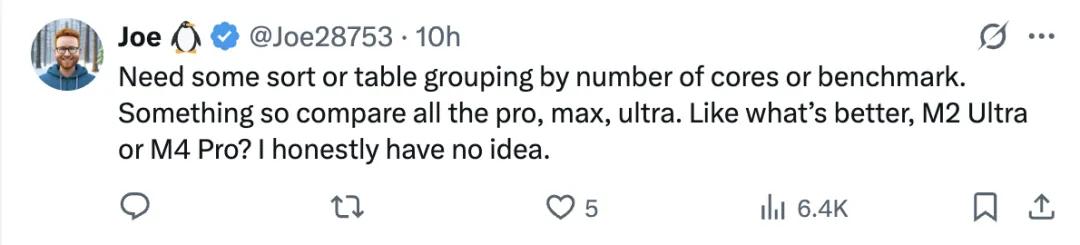 有网友就表示,真的需要一些表格,按核心数量或基准测试分组。这样可以对比所有Pro、Max、Ultra型号,