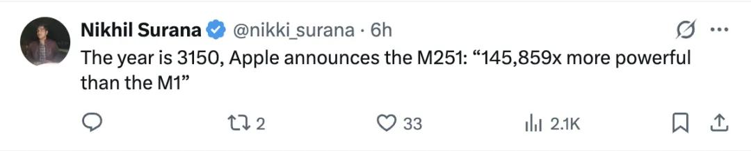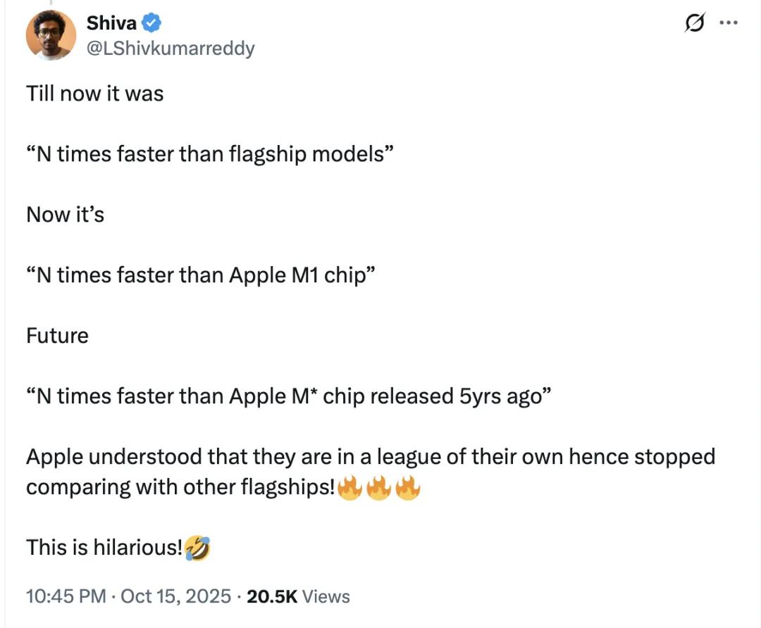 就像以前是“比其他旗舰快N倍”,现在变成了比M1快N倍,未来可能就成了比五年前发布的苹果 M* 芯片快N倍。