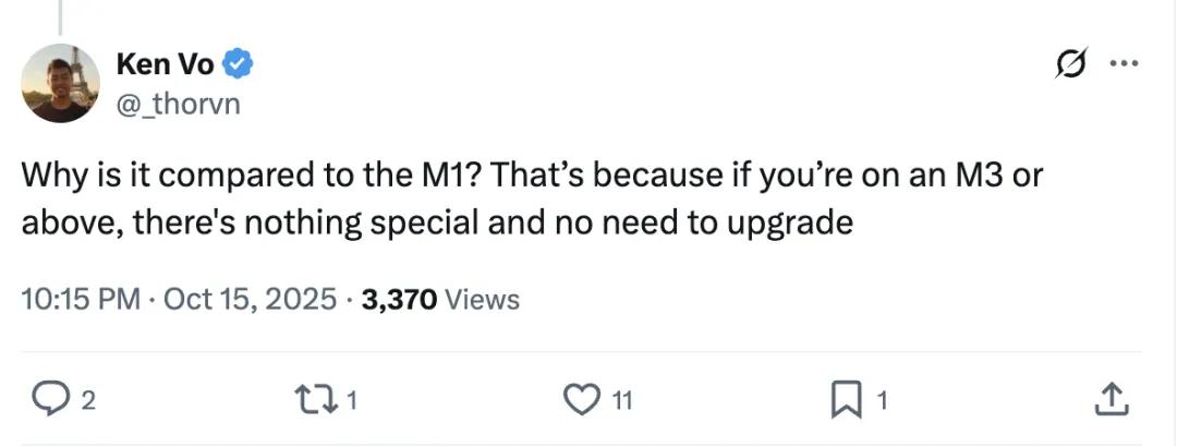 当然,也有人替苹果圆场:M5的AI性能可是比M4、M1强很多!