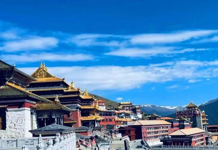 大藏寺,全名甘丹大藏恒周林,大藏寺有弥勒殿三座、宗喀巴大师殿、大雄宝殿及护法殿等六座佛殿,又有祈竹楼及堪康楼各一座作两位法台历代住锡之处。大殿之楼顶为镏金铜瓦,乃汉地皇帝所赐。寺院后山上有闭关院一座,供寺僧禅修闭关之用。