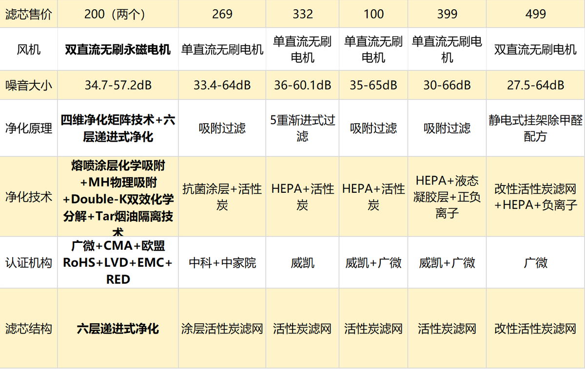 在推荐测评之前,大家先看看文中提到的六款除二手烟空气净化器的基本参数