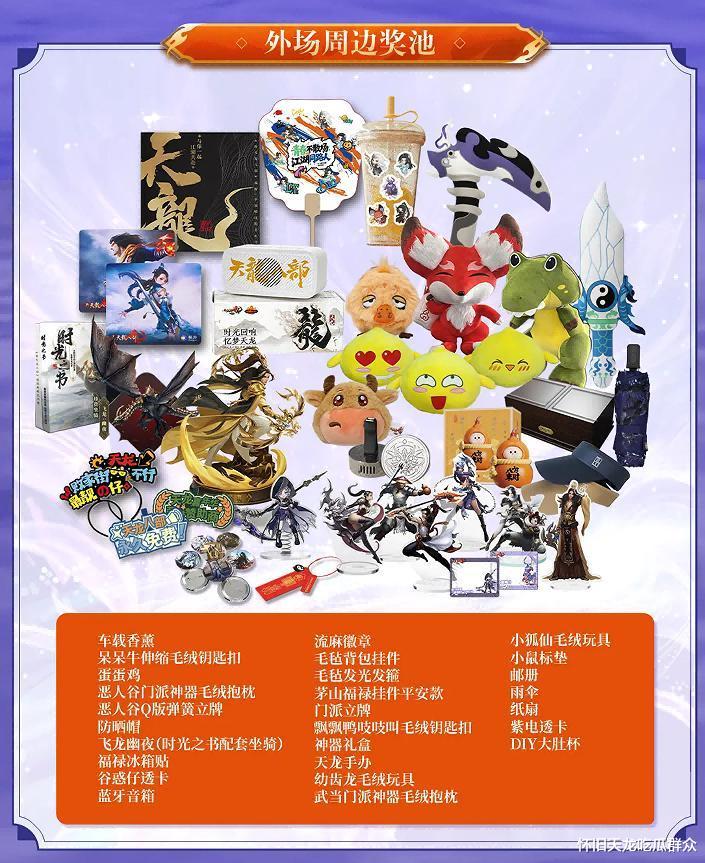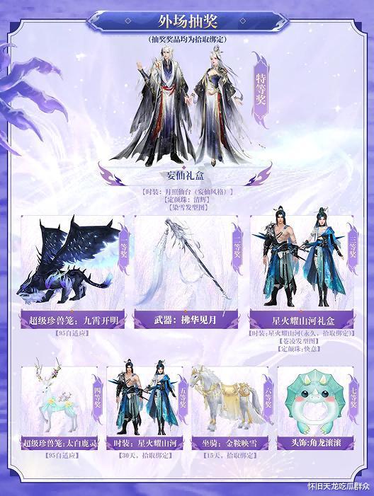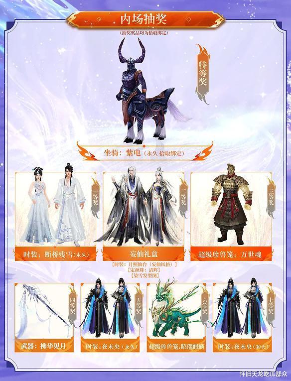 再就是外场能抽的,也就是不用嘉年华门票,但需要买了景区门票在景区内能抽的。算是内场的特等奖紫电和一等奖时装没了,但还能抽新时装幻武。