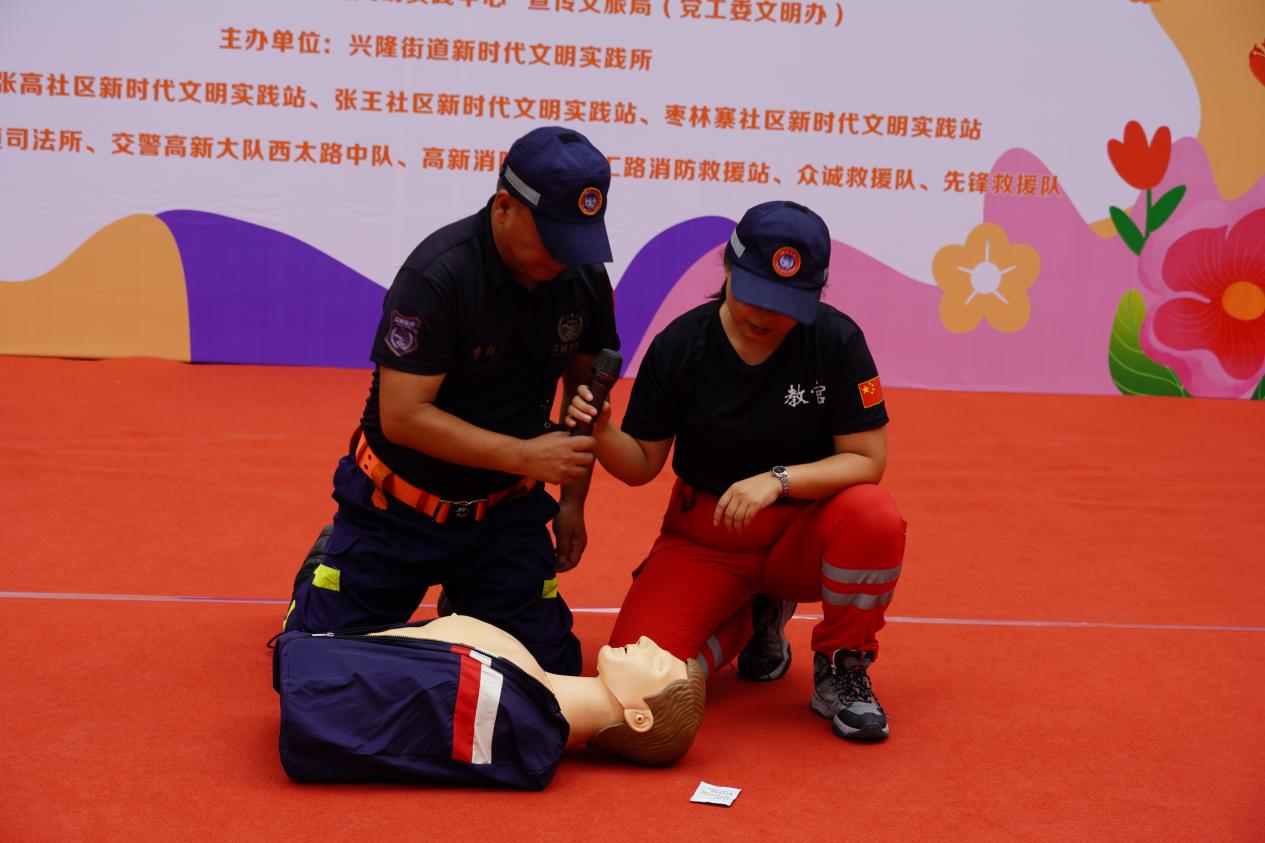 活动在精彩的腰鼓表演中拉开帷幕,优美的舞姿、欢快的笑容和层次分明的动感,尽显社区居民积极向上的新时代精神风貌。在知识宣讲环节,兴隆街道司法所工作人员人员凭借丰富的专业知识和实践经验,为居民们带来了深入浅出的法律讲解。随后,众城应急救援队队员通过模拟演示,详细讲解了心搏骤停后紧急救援常用的急救措施,为辖区居民上了一堂生命急救“必修课”。