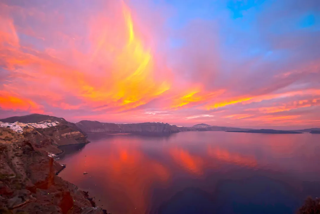 圣托里尼岛上蓝顶白墙的建筑错落有致地分布在悬崖边,与蔚蓝的大海融为一体,美得让人窒息沉醉。
