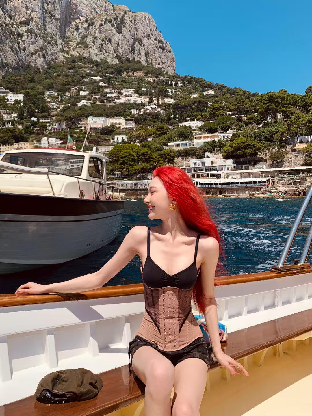 在澄澈如蓝宝石的海面旁,你以一身前卫又吸睛的造型成为焦点。红发如火焰般热烈,与碧蓝海水形成视觉冲击,瞬间点燃画面活力;黑色比基尼上衣简约性感,粉色束身马甲以精致纽扣与纹理细节,为造型注入复古优雅感,层次感拉满;黑色短裤利落随性,完美适配游艇上的休闲氛围。