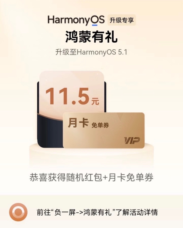 正当准备付款时,我想起了前几天刚刚把手机升级HarmonyOS 5.1系统,负一屏的“鸿蒙有礼”里似乎有不少福利。我点进去一看,发现是一个签到活动,本以为就是一些常规签到领优惠券的活动,结果几天下来,我陆续领到了华为音乐、华为阅读的7天会员和一些红包,甚至还有热门应用月卡兑换券,可以免费兑换优酷会员、B站会员等十多个会员权益!