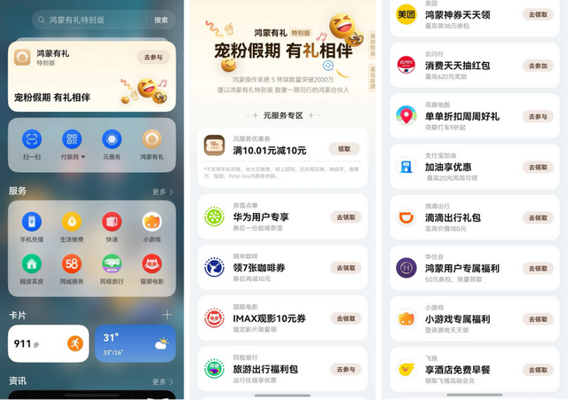 近两天,鸿蒙5终端数量已破2000万!为了回馈花粉们,国庆期间,华为特别推出“鸿蒙有礼特别版”,为鸿蒙5及以上的手机用户带来覆盖吃喝玩乐等多领域的专属权益,活动入口也是在负一屏哦,9月30日上线,记得去领福利!