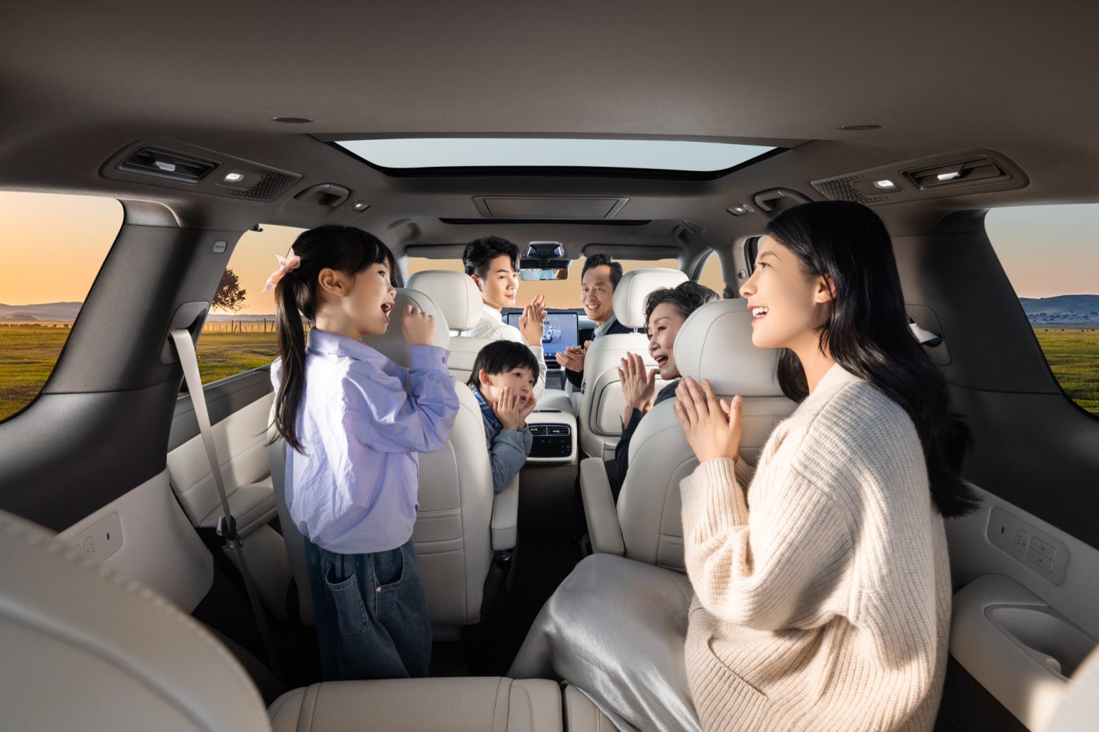 17.3 英寸二排吸顶屏支持语音控制,孩子说 “我要看动画片” 即可调出儿童内容;20 扬声器帝瓦雷音响+杜比全景声,配合 “无麦 K 歌 2.0”,六个座位均可参与互动,长途旅程减少孩子烦躁。