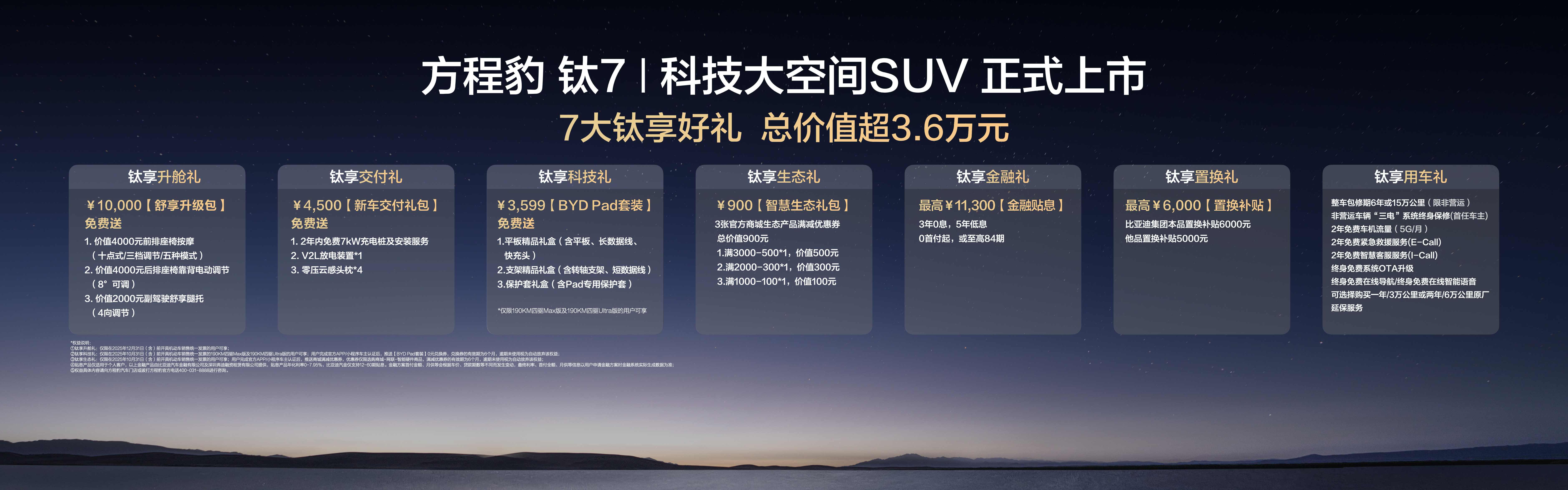 9月9日,比亚迪最新开创之作“大五座天花板”——方程豹钛7正式上市!方程豹豹7拥有着「空间魔方」的真本事!实测乘员舱有效车长3310mm,前后排头顶近1.1米高,小孩能站直进出。后备箱基础容积970L+车尾小书包32.5L,直接干到千升级容量。二排放倒秒变1.8米纯平大床,实测能塞公路自行车+全套露营装备。全车47处储物格设计,奶粉玩具零碎全归位。后排兼容双13英寸BYD Pad,带娃时开儿童监控模式,家长前排一键接管空调座椅。车顶内置灵鸢无人机,露营自动起飞拍大片;后备箱抽出比亚迪电动滑板,下车代步无缝衔接。更硬核的是ISOFIX接口的智能儿童/宠物座舱,上车通风监控、下车当拉杆箱遛娃遛狗。冷暖冰箱支持-6℃冻饮料到50℃温奶,都市通勤瑞幸咖啡刷脸即取。通过双层悬浮仪表台+模块化方舟护甲设计,让3.3米车长玩出百变空间,这就是混动方盒子的空间重构逻辑!这次钛7则平衡了个性与家庭的二元对立,实现了潮酷外观与舒适品质的兼得,让新潮家庭既不用委屈自己,也不用辜负家人。钛7标配比亚迪天神之眼智能辅助驾驶,拥有越级的TSC高速爆胎辅助稳定控制系统;采用“七横九纵”的高刚性车身结构,全车装配9个安全气囊,让出行有底气,让驾驶更安心!钛7以安全为基,辅以户外空间魔法与生活科技服务,对于追求品质生活与家庭需求的用户而言,以全方位的优势碾压同级,成为家用硬派全新品类超值之选!
