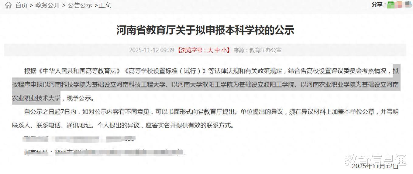 11月12日,河南省教育厅官网发布《河南省教育厅关于拟申报本科学校的公示》,拟按程序申报以河南科技学院为基础设立河南科技工程大学、以河南大学濮阳工学院为基础设立濮阳工学院、以河南农业职业学院为基础设立河南农业职业技术大学。