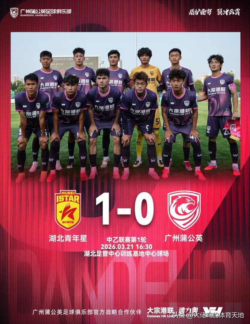 3月21日,2026赛季中乙联赛预赛阶段首轮,阵容层面大面积革新的广州蒲公英客场挑战湖北青年星。90分钟鏖战,球队在场面上占据主动、数据层面优势明显,却因一次回传失误被对手抓住机会破门,最终0-1惜败,遗憾未能迎来赛季开门红。这场得势不得分的比赛,既有年轻球队的青涩与短板,更藏着新体系下的战术成型与精神风貌,虽然说结果不理想,但笔者认为依然是为漫长赛季写下充满希望的开篇。