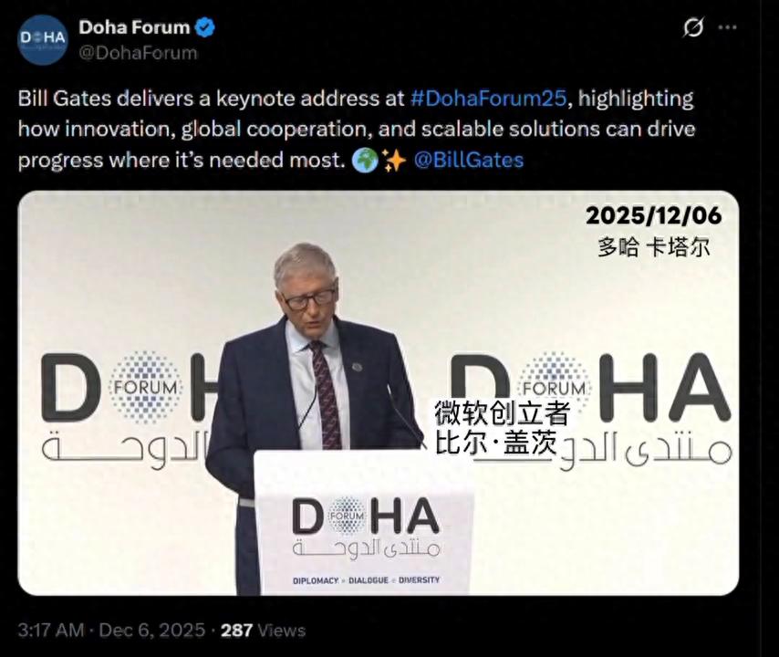 比尔·盖茨在多哈论坛上发言、承诺为全世界接种疫苗