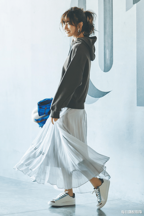 百褶裙中和了卫衣的中性气质,让造型更温柔耐看。