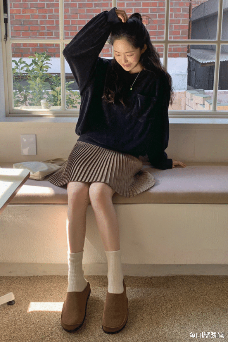 整体遵循“上松下垂”的逻辑:卫衣带来轻松感,百褶裙用流畅线条修饰身材。这样就能显瘦显高,而不是臃肿。✨